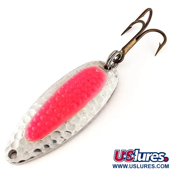 Affichant un poids de 1/2 oz (14 g), ce corps en laiton épais est conçu pour percer les vents côtiers et atteindre facilement les fosses profondes des rivières. Sa longueur de 2 1/4" (5,5 cm) présente une finition classique en nickel martelé, élaborée pour disperser la lumière à l'image des écailles réfléchissantes d'un poisson-fourrage. Une caractéristique distinctive du code 12363 est l'insert unique simulant un œuf de saumon ; sur ce modèle Blue Fox Pixee UV spécifique, cet insert rouge constitue une cible à haute visibilité qui brille intensément dans les eaux sombres ou par faible luminosité. Il est équipé d'un hameçon triple à finition bronze et d'un anneau brisé robuste, prêt pour les tensions liées à la capture du saumon, de la truite arc-en-ciel ou du brochet. Ce leurre tire ses origines des designs originaux National Expert Bait, perfectionnés pour un roulis naturel dans les veines d'eau ou une trajectoire stable à la traîne. Cet exemplaire est en excellente forme, montrant des signes évidents de stockage soigné, et obtient une note d'état de 5/5.