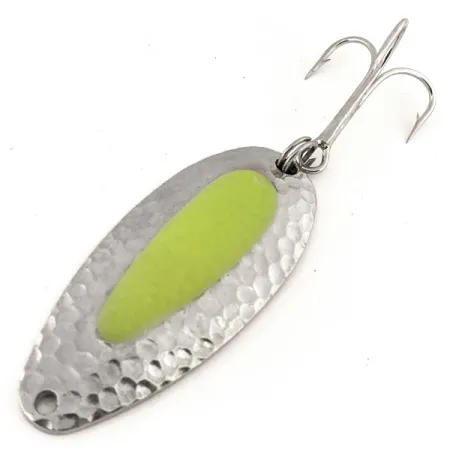 Mesurant 6,5 cm (2 1/2 pouces) de long, le corps en laiton de forte épaisseur de cette cuillère est conçu pour percer les vents côtiers et atteindre les fosses profondes où se tiennent souvent les saumons et les truites steelhead. La finition en nickel martelé offre une surface texturée qui capte et diffuse la lumière, tandis que l'insert central jaune vif, imitant un œuf de saumon, est doté d'une lueur UV pour rester visible en eaux troubles ou par faible luminosité. Portant le code produit 12701, ce leurre de 24 g (3/4 oz) ne présente aucun signe d'usure et affiche un état de 5/5. Faisant initialement partie de la gamme National Expert Bait (NEBCO) avant la transition vers Blue Fox, ce modèle spécifique est équipé d'un hameçon triple de haute qualité relié par un anneau brisé robuste. C'est un choix efficace tant pour le lancer dans les courants forts des rivières que pour la traîne en pleine eau, où sa densité permet une présentation profonde. L'extrémité avant dispose d'un point d'attache unique et propre, conçu pour être utilisé avec un émerillon à agrafe afin de faciliter un mouvement de roulis naturel lors de la récupération.
