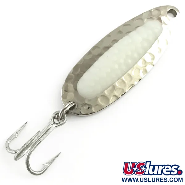 Le corps en laiton massif de 7g (1/4oz) de cette cuillère porte au revers les marquages Blue Fox authentiques, signes distinctifs du design classique Pixee. La face avant présente une finition en nickel martelé profondément texturée pour un éclat maximal, centrée par un insert blanc lisse réactif aux UV simulant une grappe d'œufs de saumon. Mesurant 4,5 cm (1 3/4"), ce spécimen (Code Produit : 5815) est conservé dans un état 5/5, avec une surface réfléchissante brillante et un hameçon triple piquant. La plaque arrière plate et polie est frappée de l'inscription « PIXEE PAT. » et de l'indication du poids. Conçue pour les lancers longue distance en eau douce comme en mer, sa densité lui permet de papillonner et de rouler efficacement dans les courants de rivière ou les zones lacustres profondes. Le noyau blanc fluorescent reste visible pour les carnassiers par faible luminosité ou dans les profondeurs où pénètrent les rayons UV.