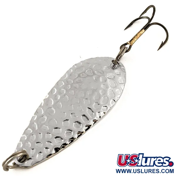 La texture en nickel martelé définit la face de cette cuillère Blue Fox Strobe, offrant une esthétique classique qui reste un incontournable pour de nombreux pêcheurs. Identifié par le code produit 11867, ce leurre pèse 2/5 oz (11g) pour une longueur totale de 2 1/4" (5,5 cm). Ce spécimen conserve une note de condition de 6, les surfaces métalliques et l'armement paraissant sortir d'usine. Le revers est frappé du poinçon Blue Fox et du poids, reflétant son origine USA. Un hameçon triple standard est fixé à la queue via un anneau brisé, garantissant que le leurre est complet et prêt pour le lancer ou la traîne.