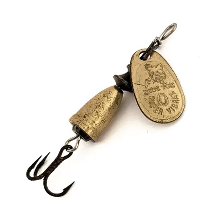 Directement estampillés sur la palette en laiton, le logo Blue Fox original et le marquage « Super Vibrax » identifient cette cuiller tournante classique de taille 0. Pesant 3,4 g (1/8 oz), ce modèle compact mesure exactement 4,5 cm de l'œillet supérieur à la courbure de l'hameçon triple. La finition laiton vieilli du corps en forme de goutte et de la palette ovale reflète son caractère vintage authentique (état 4/5). Le revers de la palette révèle son origine avec la gravure « MADE IN FINLAND » et le brevet américain 4163338, attestant de sa conception anti-vrillage. Le corps en forme de cloche abrite un mécanisme interne qui génère des sons basse fréquence lorsque la cloche extérieure le percute lors de la récupération. Ce modèle particulier, code produit 13178, arbore la finition laiton emblématique, incontournable pour la truite et les carnassiers en eaux claires. L'armature reste robuste, avec un triple d'origine au fini sombre solidement fixé à l'axe. Ces anciens modèles de fabrication finlandaise sont très prisés des collectionneurs pour la résonance unique de la cloche en laiton et la précision de l'assemblage.