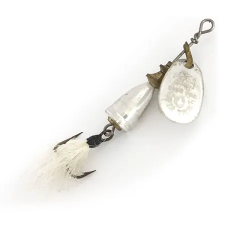 L'argenture sur la palette et le corps en cloche confère à ce modèle un profil classique réfléchissant la lumière qui attire l'œil de tout passionné de matériel vintage. Mesurant 5 cm pour un poids de 3,54 g, ce Blue Fox Super Vibrax 0 Foxtail (Code Produit 9146) présente la conception emblématique de la cloche en deux parties. La palette porte l'estampille « MADE IN FRANCE », un détail recherché par les collectionneurs car il indique l'époque de production initiale de la gamme Vibrax avant les délocalisations de fabrication. Un pompon de plumes blanches monté à la main recouvre l'hameçon triple, ajoutant un profil visuel distinct et une texture plus souple à la queue. La finition argentée reste brillante et les composants internes aux tons laiton sont bien conservés, ce qui vaut à ce leurre une note d'état de 5/5. Le corps en forme de cloche est conçu pour émettre un bourdonnement sonore basse fréquence lorsque le composant interne tourne contre la coque extérieure lors d'une récupération linéaire. Une armature en fil d'acier robuste relie la palette montée sur étrier à l'hameçon habillé, maintenant l'intégrité structurelle pour la pêche à l'ultra-léger de la truite ou de la perche.