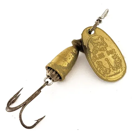 Estampillée du logo reconnaissable à tête de renard, la palette ovale de cette cuiller de 4 g (1/8 oz) identifie immédiatement ses origines finlandaises. Cette Super Vibrax de taille 1, identifiée par le code produit 12061, présente une finition classique en laiton vieillie naturellement. Mesurant 5 cm (2") de long, le corps en forme de cloche de la cuiller présente un léger amincissement de la finition sur la surface extérieure, révélant le métal sous-jacent. Le mécanisme d'engrenage interne, conçu pour percuter la cloche lors de la récupération, est clairement visible à la base du corps. Ce spécimen affiche un état 4/5 bien conservé, l'hameçon triple montrant un léger assombrissement de surface tout en conservant son intégrité structurelle. L'axe en acier reste droit avec une boucle d'attache serrée, et la palette en laiton présente de légères éraflures dues à l'utilisation sur le terrain.