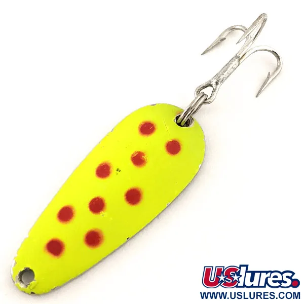 Revêtue d'une peinture chartreuse vibrante avec des points rouges distinctifs, cette cuillère de fabrication américaine est conçue pour une visibilité accrue dans diverses conditions de clarté de l'eau. Présentée à l'état neuf (note 6), la finition reste nette et réfléchissante sur l'ensemble du profil de 5 cm (2"). Si le chartreuse fluorescent ressort en plein jour, l'utilité spécifique de cette Blue Fox Tor-P-Do UV provient de son revêtement réactif qui brille intensément sous la lumière UV, faisant apparaître les points rouges comme des points d'attaque sombres et très contrastés. Un hameçon triple robuste est fixé par un anneau brisé solide à la face inférieure nickelée et polie, contribuant à un poids total de 14 g (1/2 oz) pour un lancer efficace ou un jigging vertical. Portant le code produit 12796, ce leurre utilise sa forme de larme et son corps lesté pour maintenir sa stabilité lors de la traîne en profondeur.