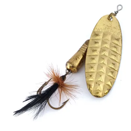La palette dorée est frappée du marquage distinct 'WHISPER' ainsi que de la désignation de taille 3. Ce Blue Fox Whisper 3, identifié par le code produit 10404, présente une texture martelée en forme de diamant sur sa palette ovale, conçue pour capter la lumière sous différents angles. Mesurant 7 cm (2 3/4") de longueur totale, le leurre pèse 11,5 g (2/5 oz), offrant ainsi une masse suffisante pour des lancers précis dans divers environnements. Le corps lesté en laiton massif est suivi d'un hameçon triple habillé d'une combinaison de hackle beige et de plumes noires. Des marques de surface légères et une légère oxydation sur les composants métalliques indiquent un état de 4/5. Blue Fox a conçu cette cuiller tournante fabriquée aux États-Unis avec une répartition du poids équilibrée pour une stabilité optimale, qu'elle soit récupérée en lac ou dans des courants de rivière modérés.