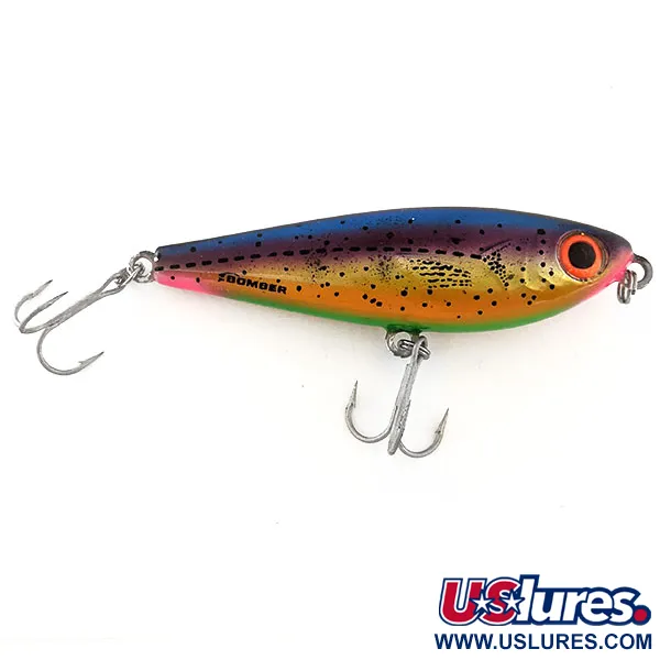 S'inspirant de la palette classique Rainbow Trout, ce modèle arbore une transition vibrante du violet au bleu sur le dos, se fondant dans un flanc jaune doré parsemé de fines taches noires. Avec un poids solide de 1/2 oz (14 g) et une longueur de 3 1/2" (9 cm), il est conçu pour la distance lors de la traque du brochet ou de la perche en surface. La désignation « Low Pitch » fait référence à l'acoustique interne conçue pour produire un son grave, offrant un profil sonore différent des leurres à billes haute fréquence traditionnels. Un œil distinctif cerclé d'orange constitue un point focal à fort contraste sur la tête à texture métallique. Portant le code produit 11384, le leurre est marqué du nom Bomber sur le côté et conserve son armement d'origine. Dans son état 5/5, la peinture reste brillante et les hameçons triples sont propres, témoignant de la construction durable de ce leurre fabriqué aux États-Unis. Un subtil accent rose le long du ventre complète ce profil réaliste d'imitation de truite.