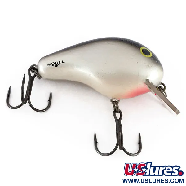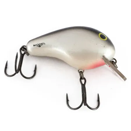 Fabriqué en bois de balsa à haute flottabilité, ce crankbait shallow-runner de 1/2oz (14g) illustre le savoir-faire typique du matériel de pêche américain vintage. Les flancs gris argenté se transforment en un dos sombre moucheté de paillettes, accentué par une tache rouge distincte sur la gorge et des yeux jaunes classiques. Estampillé clairement sur le flanc avec la désignation 'MODEL B' et marqué 'BOMBER' près de la queue, ce spécimen est le BOMBER Balsa Model B BB5SL. Mesurant 2 1/4" (6cm), le leurre est doté d'une bavette carrée transparente conçue pour des profondeurs de 0 à 0,9 m lors de la récupération au lancer. Ce leurre fabriqué aux USA, identifié par le code produit 9812, se présente dans un état impeccable 5/5, avec un armement et une finition de corps très bien entretenus. Deux hameçons triples tranchants sont fixés solidement via des anneaux brisés robustes, prêts pour la boîte à pêche ou l'exposition.