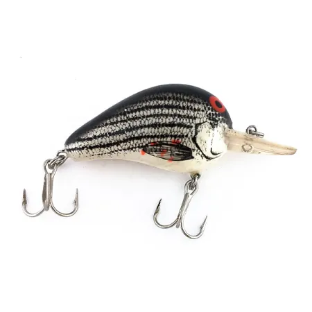 Orné d'un motif classique d'écailles rayées et d'yeux rouges frappants, ce modèle de 4 cm (1 1/2") est un incontournable de la catégorie light-cranking. Pesant 5,5 g (3/16 oz), le Bomber Fat A B04F, identifié par le code 9549, présente un profil compact et trapu conçu pour lancer vers des espèces comme la perche et le chevesne. La robe affiche un dos sombre et uni transitionnant vers des flancs argentés gravés de lignes horizontales précises pour imiter de petits poissons fourrage. Sa bavette ronde transparente est conçue pour atteindre des profondeurs de 1,2 - 1,8 m (4-6 ft), offrant une présentation fiable à mi-profondeur. L'armement se compose de deux hameçons triples d'origine fixés par des anneaux brisés robustes. Ce leurre fabriqué aux USA est en état 5/5, conservant une finition impeccable sur son ventre blanc et ses flancs à motifs.