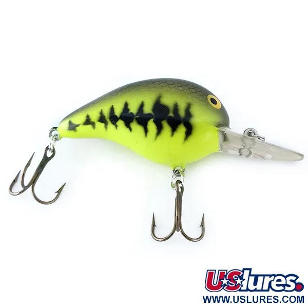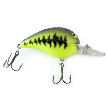 Les détails de la finition Baby Bass sur ce leurre de 5 cm (2") offrent un profil à haut contraste qui se démarque dans diverses conditions d'eau. Ce Bomber Fat A B05F, identifié par le code produit 11084, est un crankbait flottant classique fabriqué aux USA pesant 10 g (1/3 oz). Il est doté d'une bavette transparente intégrée robuste conçue pour emmener le leurre à une profondeur de nage de 1,8 à 2,4 m (6-8 ft), ce qui en fait un choix fiable pour cibler la perche ou le chevesne au lancer. L'exemplaire est dans un état impeccable de 5/5, avec la peinture et l'armement d'origine en excellente condition. Le motif de couleur passe d'un dos olive foncé à des flancs chartreuse brillants, accentués par le motif de taches latérales sombres emblématique. Deux hameçons triples tranchants sont fixés au ventre et à la queue par des anneaux brisés standards. Les grands yeux jaunes surdimensionnés sont la signature de cette série, offrant un point focal distinct à l'avant du corps.