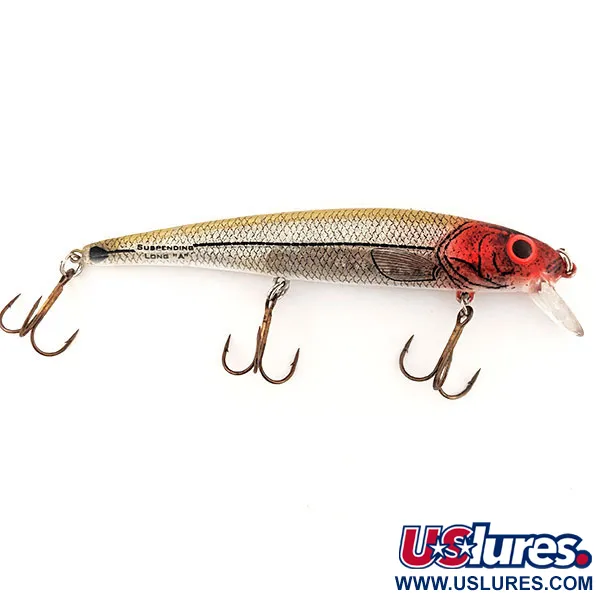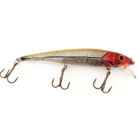 Une tête rouge frappante contraste nettement avec le corps aux écailles argentées de ce spécimen classique fabriqué aux États-Unis. Pesant 14 g (1/2 oz) pour une longueur de 12 cm (4 3/4"), ce Bomber Long A15A porte le code produit spécifique 12865 et présente le marquage reconnaissable "SUSPENDING LONG 'A'" imprimé clairement sur son flanc. Ce poisson-nageur suspending bruiteur est conçu pour le lancer comme pour la traîne, atteignant des profondeurs comprises entre 1,2 et 1,8 m (4-6 ft). Le motif d'écailles argentées est complété par une ligne latérale sombre marquée et un œil cerclé de rouge. Les trois hameçons triples d'origine sont solidement fixés, témoignant de son état de conservation 5/5. La bavette transparente et arrondie reste propre et intacte, fermement fixée au nez du leurre.