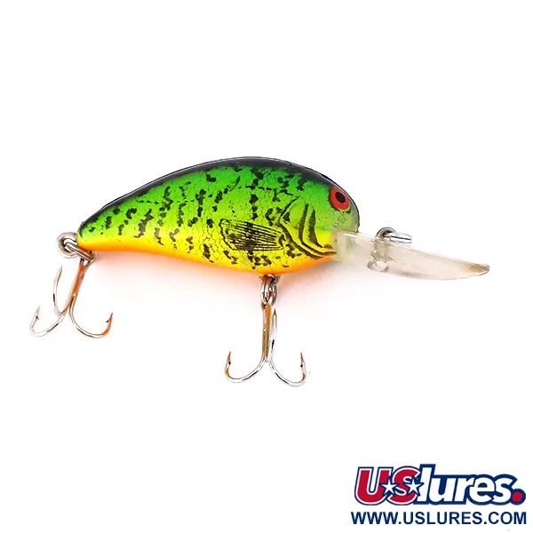 Pesant 1/3 oz (9 g), cette variante du Bomber Model A fabriquée aux États-Unis présente une finition spécialisée conçue pour la visibilité par faible luminosité. Le corps est revêtu d'un motif jaune et vert fluorescent à haute visibilité avec des mouchetures sombres rappelant des écailles, spécifiquement conçu pour ses capacités de réflexion UV. Comme le montre la deuxième image, la peinture réactive aux UV réagit sous certains spectres lumineux, une caractéristique technique intégrée par Bomber pour aider les pêcheurs ciblant le sandre ou le brochet dans des environnements profonds ou troubles. Référencé sous le nom de Model 6A, ce crankbait est conçu pour atteindre des profondeurs de 1,8 à 2,4 m (6-8 ft) en lancer comme en traîne. Son corps compact de 5,5 cm (2 1/4") est équipé d'une longue bavette en plastique transparent et de deux jeux d'hameçons triples tranchants au fini argenté. Noté 5/5, ce modèle reste dans un superbe état, conservant ses couleurs vives et ses composants d'origine. Un œil rouge classique constitue un point focal distinct sur la tête, préservant le look traditionnel de la série Bomber tout en intégrant la technologie moderne de phosphorescence sous le code produit 10480.