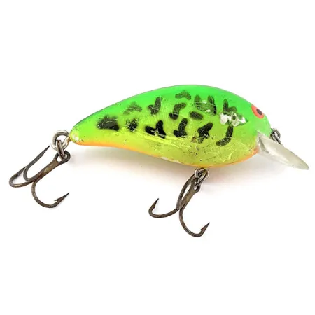Des pigments UV vibrants de type fire tiger recouvrent le corps de 5,1 cm (2 pouces) de ce crankbait, un coloris emblématique conçu pour une visibilité optimale dans diverses conditions d'eau. Cet exemplaire spécifique, répertorié sous le code produit 18484, pèse 9,4 g (1/3 oz) et constitue un choix polyvalent pour les pêches au lancer comme à la traîne. La finition présente un dos vert vif avec des taches sombres naturelles et un ventre orange chaud, associé à des yeux rouges et noirs distinctifs. En tant que modèle flottant, il est conçu pour plonger dans une zone de 0,9 à 1,8 m (3 à 6 pieds) lors de la récupération. Pour une pièce vintage, son état est évalué à 4/5 ; les surfaces sont propres, avec seulement de légères traces d'utilisation sur la bavette transparente et l'armement. Les hameçons triples d'origine sont intacts, prêts à cibler des carnassiers tels que le brochet et le sandre.
