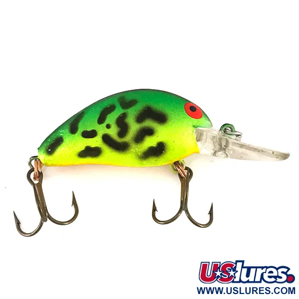 Le coloris Fire Tiger définit ce Bomber Model B 4A de 1/4 oz (7 g), arborant un dégradé classique vert et jaune avec des rayures noires distinctes. Référencé sous le code produit 7847, le leurre est dans un état 5/5, présentant un armement bien conservé et une bavette de plongée cristalline. Mesurant 1 3/4" (4.5 cm), ce crankbait flottant est conçu pour le lancer ou la traîne à des profondeurs de 3-7 ft (0,9 - 2,1 m), ciblant principalement le brochet et le sandre. Le corps fabriqué aux USA est équipé de deux hameçons triples affûtés à finition bronze, solidement fixés par des anneaux brisés de couleur cuivre. Ses yeux peints en rouge offrent un contraste saisissant avec la finition néon éclatante.