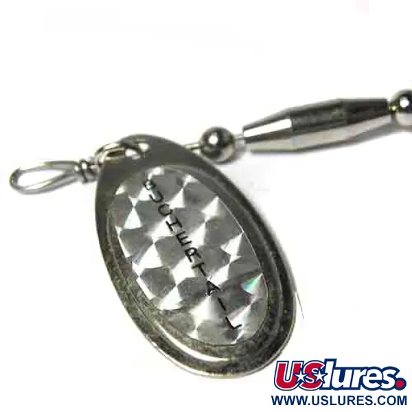 Des palettes nickelées avec un motif d'écailles holographiques distinct caractérisent ce Buchertail 500 comme une cuillère tournante classique de taille moyenne. Pesant 17 g (3/5 oz), cette création de Joe Bucher présente un corps lesté composé de perles métalliques argentées qui fournissent le lest nécessaire pour des lancers à longue distance en bordure d'herbiers ou au-dessus de bois immergés. Le bucktail noir épais est fixé par un enroulement de fil rouge proéminent, qui sert de point d'attaque visuel juste devant l'hameçon triple arrière. Ce spécimen, portant le code produit 0017, témoigne de la fabrication américaine robuste typique de la réputation de la marque pour la traque des brochets et muskies trophées. L'autocollant holographique réfléchissant sur la palette reste éclatant, conçu pour maximiser les reflets lumineux dans diverses conditions de clarté de l'eau. Concernant son état physique, le leurre affiche une note de 4/5, restant propre et bien entretenu. Il utilise un œillet en fil d'acier robuste pour une fixation sécurisée de l'avançon, une caractéristique du matériel simple et efficace qui fait la renommée de Joe Bucher.