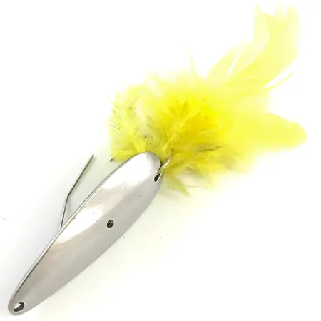 Des plumes jaune vif traînent à l'arrière de cette cuillère nickelée de 10 g (1/3 oz), offrant un contraste saisissant avec le métal poli. Les poinçons Tony Accetta et Weed-Dodger sont clairement estampillés sur le côté concave, identifiant ce spécimen de 5,5 cm (2 1/4") originaire des États-Unis. Un robuste garde-herbe en fil de fer s'arc-boute au-dessus de l'hameçon simple, une caractéristique emblématique de la conception Weed-Dodger destinée au lancer dans la végétation dense. Le placage au nickel reste exceptionnellement réfléchissant, et les accents rouges au point d'attache des plumes ajoutent une touche de couleur classique à l'ensemble. Référencé sous le code 5284, ce leurre reflète l'approche américaine du milieu du siècle pour un matériel fonctionnel et durable. Les plumes sont denses et éclatantes, tandis que les surfaces métalliques présentent une conservation remarquable, lui valant une note d'état de 5/5. L'œillet de fixation à l'extrémité étroite est propre et parfaitement circulaire.