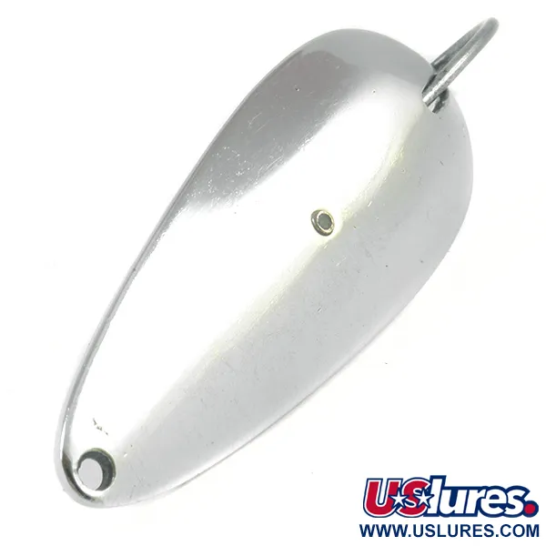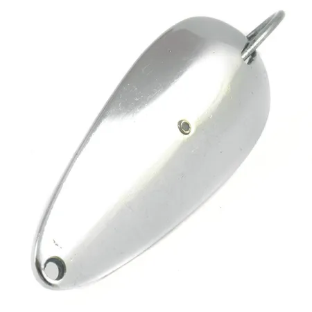 Polie avec une finition nickelée brillante, cette cuillère ondulante de 5,5 cm (2 1/4") est un emblème de la conception américaine de leurres anti-herbe du milieu du siècle. Pesant 10 g (1/3 oz), la Tony Accetta Weed Doger, identifiée par le code produit 3211, utilise un hameçon simple robuste intégré directement dans la face concave. L'hameçon est maintenu par une vis distinctive qui ancre également le garde-herbe en fil de fer, une caractéristique conçue pour lancer dans les nénuphars et la végétation dense. Les marquages 'TONY ACCETTA' et 'WEED DOGER' sont clairement estampillés à l'intérieur, confirmant son origine USA. Ce spécimen est en condition 5/5, conservant une surface miroir sur son corps en forme de larme. L'extrémité étroite comprend un trou percé avec précision pour l'attache de la ligne, tandis que l'extrémité large sert de base à l'ensemble hameçon fixe.