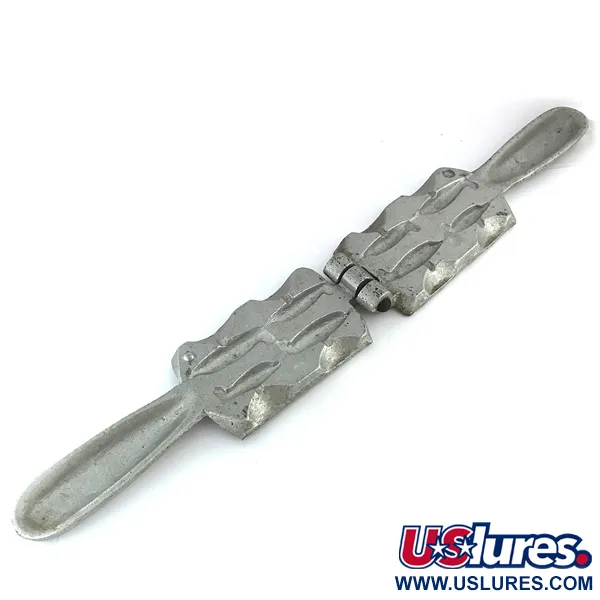 Le nom C. PALMER est clairement frappé dans le corps en métal coulé aux côtés du marquage EST. NEWTON PA, identifiant les racines de ce moule à plomb vintage en provenance des USA. Mesurant 20 cm (7 3/4") et pesant un poids substantiel de 290 g (10,2 oz), cet outil a été conçu pour permettre au pêcheur de produire plusieurs lests en une seule coulée. L'ouverture des deux moitiés articulées révèle plusieurs cavités usinées avec précision pour le moulage du plomb, tandis que les poignées intégrées offrent une prise solide. Trouvé dans un état 5/5, les surfaces gris argenté sont remarquablement propres et l'alignement de ce spécimen portant le code produit 8369 reste précis.