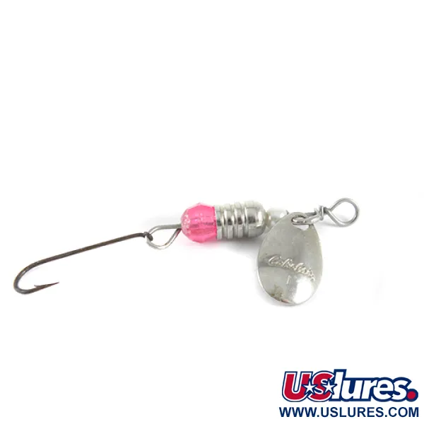 Clairement gravés dans la palette en nickel en forme de goutte d'eau, le logo Cabela's et la taille « 1 » marquent l'origine de ce leurre issu d'un nom emblématique de l'histoire de la pêche américaine. Pesant 2,5 g (3/32 oz) pour une longueur de 6 cm (2 1/4"), cette cuiller tournante présente un montage classique composé d'une perle facettée rose vif suivie d'un lest en nickel rainuré. Eine petite perle d'espacement blanche située à côté de l'étrier offre un contraste visuel subtil avec les composants métalliques polis. Un hameçon simple à tige longue est fixé à l'armature, une configuration souvent choisie pour faciliter le décrochage ou pour pêcher dans des eaux réglementées. Ce modèle fabriqué aux USA, identifié par le code 1540, affiche un caractère authentique sur ses surfaces métalliques, avec un état évalué à 4/5 tout en préservant son intégrité structurelle.