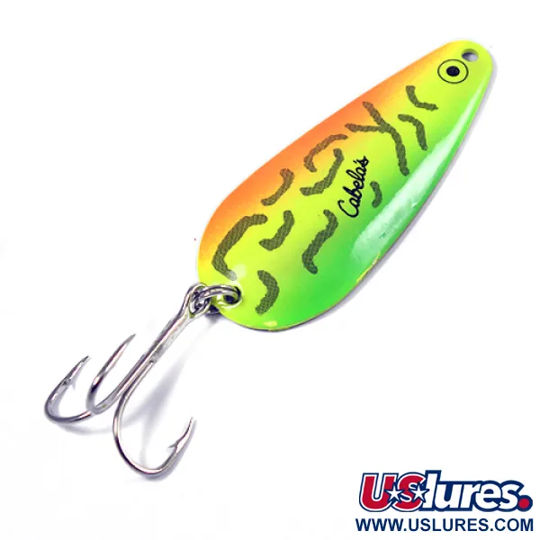 Des motifs Fire Tiger vibrants ornent la face convexe de cette cuillère métallique de 7 cm (2 3/4"), passant d'une épaule orange vif à un ventre jaune éclatant et une queue vert citron. Portant le code produit 2190, ce leurre de marque Cabela's témoigne de la fabrication classique américaine. La surface avant est détaillée avec des rayures noires sinueuses et un décalque d'œil noir distinct, tandis que le revers révèle une finition nickel hautement polie pour un éclat maximal. L'armement comprend un anneau brisé robuste à la base, fixant un hameçon triple brillant. En termes de conservation, le leurre est dans un état impeccable, semblant totalement inutilisé, ce qui lui vaut une note de 5/5. Avec un poids de 19 g (2/3 oz), la cuillère est parfaitement adaptée aux lancers lourds ou aux applications de jigging vertical.