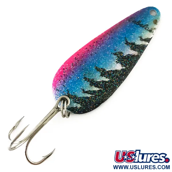 Un poids de 12 g confère à cette cuillère ondulante la densité nécessaire pour des lancers lointains en eau profonde ou à travers les courants de rivière. Le coloris Truite est visuellement saisissant, avec un dégradé rose néon et bleu vif fortement accentué par des paillettes multicolores. Le long du bord du corps de 5,5 cm, des silhouettes d'arbres à feuilles persistantes noires apportent un détail contrasté sur le fond scintillant. Sur la tête du leurre, le nom de la marque Cabela's est imprimé dans une écriture noire épurée. Le revers de la cuillère présente une finition en argent poli brillant, destinée à créer un flash lumineux qui contraste avec la face peinte. Ce spécimen fabriqué aux États-Unis, répertorié sous le code produit 8517, est équipé d'un anneau brisé durable et d'un hameçon triple piquant. Noté 5/5, le leurre est en excellent état avec une finition qui reste brillante et intacte.