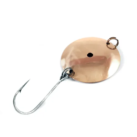 Les tons cuivrés dominent ce leurre en forme de disque de la marque Canadian Bait, portant le code produit 2959. Pesant 21 g (3/4 oz) pour un diamètre de 5 cm (2"), ce spécimen de fabrication américaine a été produit entre 1960 et 1970. Le revers présente un estampillage net de la Canadian Bait Mfg Co ainsi que la mention « PAT. APPLD. FOR », soulignant l'histoire de son développement précoce. Sa conception comprend un trou central et un hameçon simple robuste attaché via un anneau brisé. Cet exemplaire spécifique est dans un état irréprochable 5/5, préservant l'éclat original du métal. Conçu pour le lancer ou la traîne, le leurre utilise un anneau brisé monté sur le dessus comme point d'attache principal à la ligne de pêche.