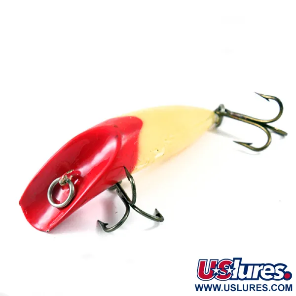 Pesant un solide 28g (1oz), cette trouvaille vintage met en avant la célèbre structure à corps creux qui définit l'héritage de la marque. La tête rouge profond transitionne vers un corps blanc crème, un motif à haute visibilité souvent privilégié pour solliciter les carnassiers dans diverses clartés d'eau. Mesurant exactement 10cm (4"), ce spécimen répertorié sous le code 1236 possède la face concave classique qui sert de mécanisme de plongée intégré. L'armement se compose de deux hameçons triples montés sur le ventre et la queue, ainsi que d'un anneau brisé robuste au point d'attache. Son état est un respectable 4/5, conservant la finition lisse et brillante appréciée des collectionneurs. Fabriqués au Canada, ces leurres sont réputés pour leur profil distinctif et leur poids substantiel facilitant les lancers.