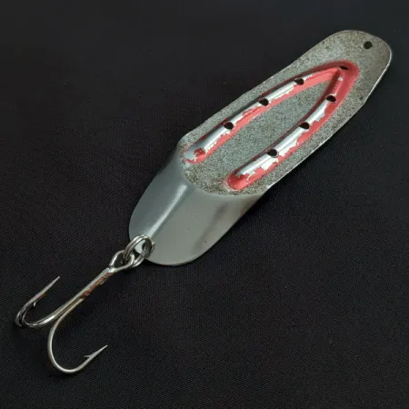 Pesant 3/4 oz (21 g), la surface nickelée de cette cuillère est agrémentée d'un panneau texturé à paillettes argentées superposé à des reflets rouges. Cette Charger №3, identifiée par le code produit 22425, mesure 11 cm (4 1/4") et bénéficie de la fabrication signature de Great Lakes Lures, réalisée aux États-Unis. L'élément de conception le plus distinctif est la série de douze trous — six percés de chaque côté de l'arête centrale surélevée — ce qui crée un profil physique unique. Au revers, le leurre affiche une finition en nickel poli impeccable. L'armement se compose d'un hameçon triple robuste fixé via un anneau brisé durable, et l'exemplaire est bien conservé, obtenant une note d'état de 5/5. Ces leurres ont été principalement conçus pour la traîne et le lancer lourd dans les grands plans d'eau douce, où la combinaison du nickel réfléchissant et de la zone rouge pailletée offre un contraste élevé.