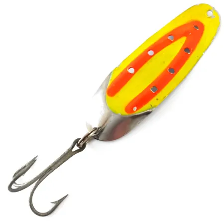 Le placage en nickel offre une finition miroir sur le revers de ce modèle 5513, qui arbore l'estampillage distinctif du designer J. Rustowicz. Pesant 12,5 g (2/5 oz), le Charger №3 UV utilise un motif jaune et rouge fluorescent à haute visibilité, accentué par neuf points spécifiques réactifs aux UV conçus pour briller dans les eaux profondes ou teintées. Ce spécimen fabriqué aux USA mesure 8 cm (3 1/4") et représente l'évolution de la marque désormais produite par Lake Products. L'état est un solide 5/5, montrant une surface remarquablement propre et une peinture vibrante comme neuve. Sa structure est centrée sur un profil de cuillère ondulante traditionnelle, associée à un hameçon triple robuste attaché via un anneau brisé renforcé pour des applications fiables de lancer ou de traîne. La finition fluorescente est intégrée directement dans l'émail supérieur, garantissant que les propriétés UV restent efficaces sous diverses conditions de luminosité.