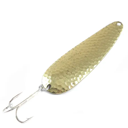 Une texture martelée distincte définit la face de cette cuillère Chippewa, un choix classique pour les pêcheurs recherchant cet effet spécifique de diffusion de la lumière sur l'eau. Clairement marquée « MADE IN U.S.A. » au verso, ce spécimen de 9 cm (3 1/2") représente le savoir-faire fiable pour lequel Worth était réputé au milieu et à la fin du XXe siècle. Pesant 19 g (2/3 oz), le leurre arbore une finition or martelé qui reste éclatante sur son corps en forme de goutte d'eau. L'armement se compose d'un anneau brisé argenté et d'un hameçon triple piquant, ce qui en fait une option robuste pour le lancer ou la traîne. Identifiée par le code produit 1744, cette pièce particulière conserve un excellent état de 4/5, présentant des surfaces bien préservées et une structure métallique propre. Son design était un incontournable des boîtes à pêche à travers les États-Unis, apprécié pour être un équipement accessible et efficace. Le haut de la cuillère possède un trou pré-percé pour l'attache de la ligne, tandis que la transition vers l'ensemble de l'hameçon est fluide et sécurisée.