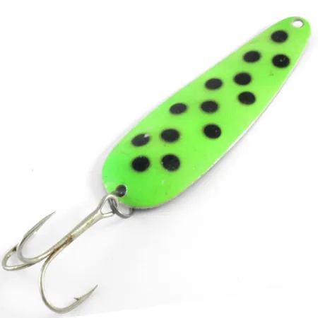 De gros points noirs contrastent fortement avec la surface peinte en vert vif de ce leurre métallique de 9 cm (3 1/2"). Produit aux USA par Worth, le modèle Chippewa était un incontournable des boîtes à pêche américaines à la fin du XXe siècle, apprécié pour ses performances solides en tant que cuillère ondulante économique. Ce spécimen particulier, portant le code produit 4230, présente une face arrière en nickel poli qui offre un éclat distinct par rapport à l'avant peint. Pesant 19 g (2/3 oz), le leurre est équipé d'un hameçon triple robuste fixé par un anneau brisé à la queue. L'état est noté 4/5, montrant une surface très propre qui conserve la saturation originale du pigment vert. Un petit trou de fixation est percé à l'extrémité étroite, conçu pour un nœud direct ou une connexion par agrafe.