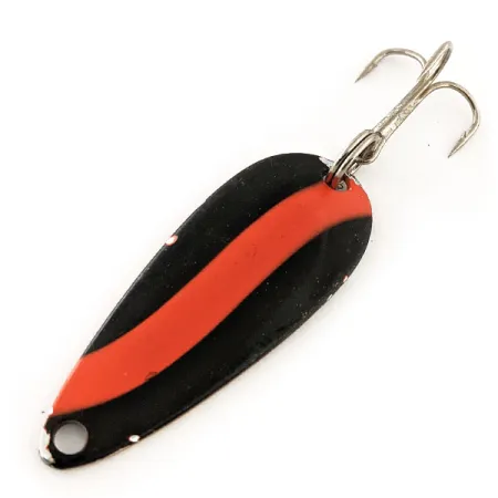 Estampillée sur le dos en nickel poli avec « MADE IN U.S.A. » et un seul « S » près de l'œillet, cette cuillère de 4,5 cm (1 3/4") illustre le design utilitaire classique qui a fait des leurres Worth un incontournable des boîtes à pêche du milieu du siècle. L'avant du corps en acier présente une large bande diagonale rouge flanquée de noir, un motif à haut contraste destiné à la visibilité. Un léger manque de peinture est visible sur les bords, donnant à ce spécimen une note de 4/5 qui témoigne de son histoire tout en restant parfaitement fonctionnel. Pesant 6 g (3/16 oz), la Chippewa Steel Spoon, identifiée par le code produit 11925, est équilibrée pour le lancer léger. L'armement comprend un anneau brisé robuste et un hameçon triple argenté piquant. Ce spécimen reflète l'époque où Worth produisait du matériel abordable et efficace pour le pêcheur quotidien.
