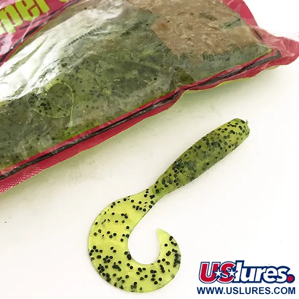 Le Chartreuse Pepper est la teinte principale de ces leurres virgules de 7 cm (2 3/4"), qui présentent une distribution dense de paillettes noires pour la texture visuelle. Fabriqués aux USA par Table Rock Bait & Tackle Co., ces leurres sont contenus dans leur sachet zippé rose d'origine portant le slogan "Lures for Lunkers". Ce paquet, identifié par le code produit 6681, contient 15 unités. La matière en plastique souple conserve sa souplesse d'origine et sa texture imprégnée de sel. Restant dans leur état d'usine d'origine, ces leurres sont inutilisés. Le sachet présente quelques froissements et une légère usure de surface typique des anciens stocks, tandis que les leurres à l'intérieur restent protégés des éléments.