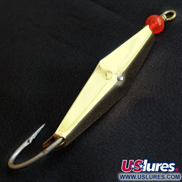 Sur la face interne est gravée la mention « THE GENUINE CLARK SQUID ST. PETE., FLA. », attestant qu'il s'agit d'une création authentique de James E. Clark provenant de la côte de Floride. Pesant 8 g (1/4 oz), ce leurre présente un profil en losange avec une finition plaquée or poli qui renvoie la lumière par de multiples facettes. Une unique perle rouge est positionnée à la tête, près de l'œillet d'attache, apportant un accent visuel subtil sur le corps métallique. Sa conception anti-herbe utilise un hameçon simple renforcé fixé par une vis centrale, une signature de l'approche fonctionnelle du fabricant pour la pêche côtière. Cet exemplaire, identifié par le code produit 18817, est dans un état 5/5, conservant une surface réfléchissante éclatante et un armement impeccable. L'hameçon est intégré à la géométrie de la cuiller via un petit bloc de montage sur la face concave.