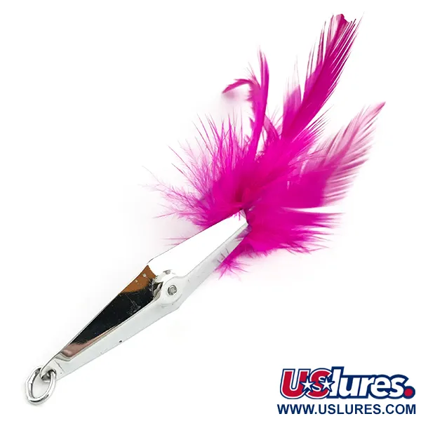 Pesant 5 g (3/16 oz), le corps de cette création de James E. Clark est rehaussé par un bouquet de plumes rose vif. Mesurant 4,5 cm (1 3/4"), ce Clark Spoon spécifique, identifié par le code produit 5856, présente une finition chrome poli typique des cuillers américaines de haute qualité. Sa conception anti-herbe repose sur un hameçon simple dissimulé dans les plumes, conçu pour naviguer dans les zones encombrées sans s'accrocher. La surface métallique réfléchissante et l'armement sont bien conservés, ne montrant que de légères marques de manipulation correspondant à un état de 4/5. Un anneau brisé unique est monté en usine sur l'œillet avant pour faciliter la connexion directe du bas de ligne.