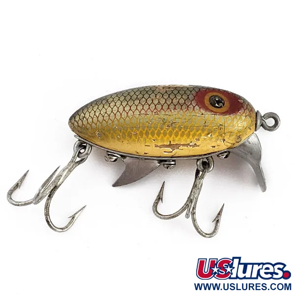 Le bois de Jelutong constitue la base flottante de ce modèle de 9 g (1/3 oz), un matériau de choix prisé par les premiers artisans pour sa facilité de sculpture et sa stabilité. La finition à écailles dorées est soulignée par un cerclage rouge vif autour de l'œil, une esthétique classique qui définit le Strike King Clarks Water Scout Wood. Conçu comme un poisson-nageur flottant de type 'shallow runner', il évolue à une profondeur de nage comprise entre 0,3 et 0,9 m (1-3 ft). Sa configuration comprend deux hameçons triples montés sous le ventre et une imposante bavette métallique fixée par des vis à tête plate. D'une longueur compacte de 5 cm (2"), ce leurre porte le code produit 23095. Son état physique est évalué à 4/5, présentant quelques craquelures de surface sur la peinture ainsi qu'une oxydation sur la bavette métallique et les hameçons. Cette rareté témoigne d'une époque spécifique de l'histoire du matériel de pêche, où la construction en bois et les bavettes métalliques étaient la norme pour la prospection des zones peu profondes.