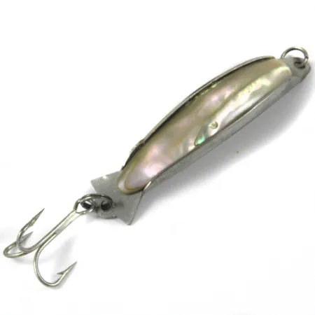 Pesant 12g (2/5oz), le corps nickelé massif de cette cuillère ondulante japonaise présente une incrustation de nacre véritable nichée dans son cadre incurvé. L'iridescence naturelle de la coquille offre des reflets rose et vert, une caractéristique de conception typique des leurres Compac du milieu du siècle destinés à imiter le chatoiement des poissons fourrages. Mesurant 6,5 cm (2 1/2"), le verso est clairement estampillé du nom du fabricant et du pays d'origine. Ce spécimen, identifié par le code 3091, conserve un fini brillant avec une note de condition de 4/5, ne montrant que de très légères marques de manipulation. L'armement se compose d'anneaux brisés d'origine et d'un hameçon triple piquant, suggérant une conception robuste pour le lancer ou la traîne. L'intégration de matériaux organiques dans le métal témoigne d'une époque où les fabricants de leurres privilégiaient les éléments naturels réfléchissant la lumière aux pigments synthétiques.