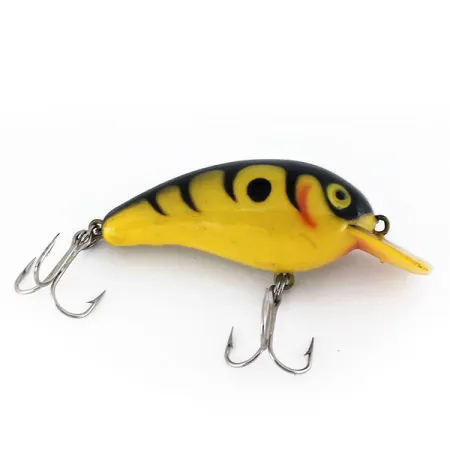 Des barres verticales noires et des points circulaires contrastent avec le corps jaune vif de ce poisson-nageur classique. Ce Cotton Cordell Big O, code 9986, pèse 1/4 oz (7 g) et mesure 2" (5 cm) de long. Conçu comme un leurre flottant et bruiteur, il plonge à des profondeurs de 0,6 à 1,2 m (2-4 ft) lors de la récupération. Ce modèle fabriqué aux États-Unis est idéal pour le lancer ou la traîne du brochet et de la perche. L'état est noté 5/5, affichant une finition propre et un armement bien entretenu comprenant deux hameçons triples argentés. Une touche de peinture rouge souligne les ouïes, ajoutant un signal visuel traditionnel à l'avant du leurre, à côté de la bavette jaune.