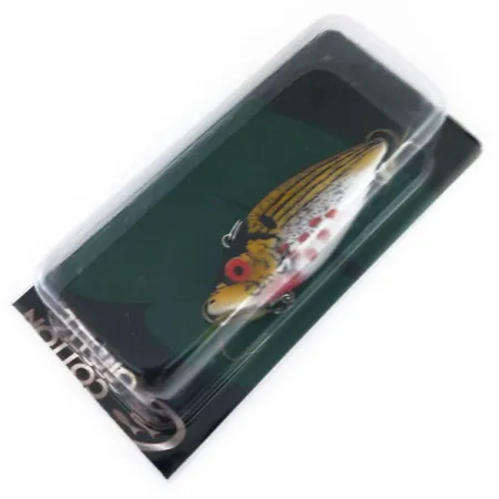 Orné d'un motif frappant de rayures verticales audacieuses sur un dos doré, ce spécimen transitionne vers un ventre blanc marqué de points rouges distincts. Identifié par le code produit 9743, ce Super Spot de 1/4 oz (7 g) présente un œil rouge vif qui sert de point focal sur sa tête aux tons jaunes. Le leurre mesure 2 1/4" (5,5 cm) de long et reste dans son emballage d'origine ; étant en condition 6, il est entièrement inutilisé et conservé exactement comme il a quitté l'usine. Cotton Cordell a conçu ce lipless crankbait coulant et bruiteur pour une variété de techniques, notamment le lancer et la traîne à profondeur variable. Cette polyvalence en fait un incontournable pour cibler des espèces allant de la perche et du brochet à la truite et au saumon. La lignée Super Spot est significative dans l'histoire de la marque, car Cotton Cordell a contribué à lancer la catégorie des lipless crankbaits avec des modèles comme celui-ci, enracinés dans leurs origines de Hot Springs, Arkansas. L'armement est soigneusement logé à l'intérieur du blister, garantissant que la finition et les composants restent dans un état impeccable.