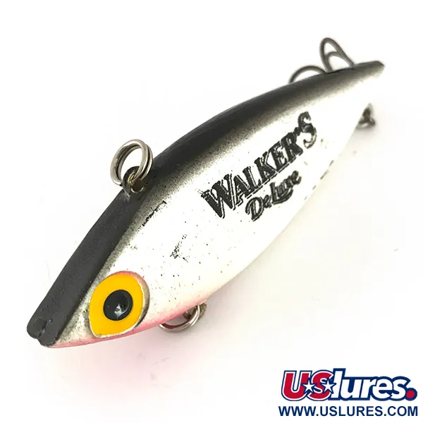 Mesurant 7,5 cm (3"), ce poisson nageur coulant sans bavette (lipless) présente le profil classique du savoir-faire artisanal de Cotton Cordell. Les flancs argentés sont accentués par de fines mouchetures noires, avec un dos noir uni et une gorge rose tendre. Référencé sous le code 7751, ce leurre possède un design bruiteur (rattle) lesté d'un poids de 14 g (1/2oz). Cet exemplaire spécifique est en excellent état (5/5), conservant le lettrage noir 'WALKER'S Deluxe' net estampillé sur le flanc. Conçu pour le lancer ou la traîne à profondeur variable, il est doté d'une attache de ligne supérieure et de deux hameçons triples robustes. Le fabricant basé dans l'Arkansas a utilisé un œil peint jaune vif avec une pupille noire pour créer un point focal sur la tête.