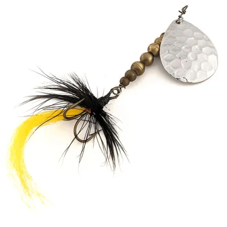 Des billes de laiton graduées constituent le corps de ce leurre de fabrication française, offrant un poids équilibré de 7g (1/4oz) pour le lancer. Ce C.P. Spoon, répertorié sous le code produit 12638, arbore une palette classique en nickel martelé qui contraste avec les tons chauds des composants en laiton. Mesurant 8cm (3 1/4") de l'œillet supérieur à l'hameçon, l'ensemble dispose d'un hackle en plumes noires soigneusement enroulé et d'un pompon en laine jaune vif sur le triple. L'armature, comprenant l'axe en acier und l'étrier, est robuste et parfaitement alignée, confirmant un état de 5/5. Les leurres C.P. Swing français sont réputés pour cette forme de palette en goutte d'eau et ce fini texturé, ici parfaitement net. L'hameçon habillé reste dense et les ligatures métalliques en tête et en queue sont serrées et sécurisées.