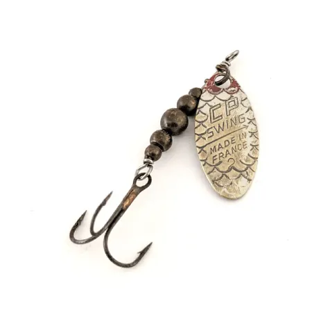 Les tons argent et laiton caractérisent cette cuillère tournante française classique, un incontournable pour les pêcheurs de truites et de perches. Pesant 2,7 g (3/32 oz) pour une longueur de 4,5 cm (1 3/4"), la CP-Swing 2 (code 12625) arbore une palette texturée emblématique clairement marquée de son origine française. Cet exemplaire spécifique bénéficie d'une note d'état de 5/5, présentant une finition impeccable sur la palette argentée et les billes de corps dégradées de couleur bronze. L'armature se compose d'une tige centrale robuste menant à un hameçon triple piquant, respectant l'intégrité de la conception originale. Sa fabrication reflète les standards de production du milieu du siècle qui ont rendu ces leurres très réputés pour le lancer ultra-léger.