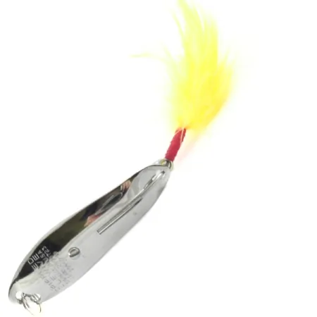 La finition en nickel poli capte la lumière sur cette cuillère de 6,5 cm (2 1/2"), mettant en valeur sa conception anti-herbe distinctive. Pesant 12,5 g (2/5 oz), le leurre Crippled Alewive présente une construction inhabituelle qui inclut un goujon de montage spécialisé sur le ventre intérieur de la cuillère. L'hameçon simple est protégé par un garde-herbe en fil de fer et orné d'un teaser en plumes jaune vif fixé par un enroulement serré de fil rouge au niveau de l'œillet. Sur le côté concave du métal, on distingue nettement le nom « CRIPPLED ALEWIVE » frappé ainsi que son origine USA, marque de la fabrication américaine du milieu du siècle. Ce spécimen spécifique, identifié par le code produit 4138, conserve une note d'état de 5/5, affichant des surfaces de placage très propres. L'association du corps réfléchissant et du trailer en plumes a été conçue pour les pêcheurs ciblant les carnassiers dans la végétation dense.