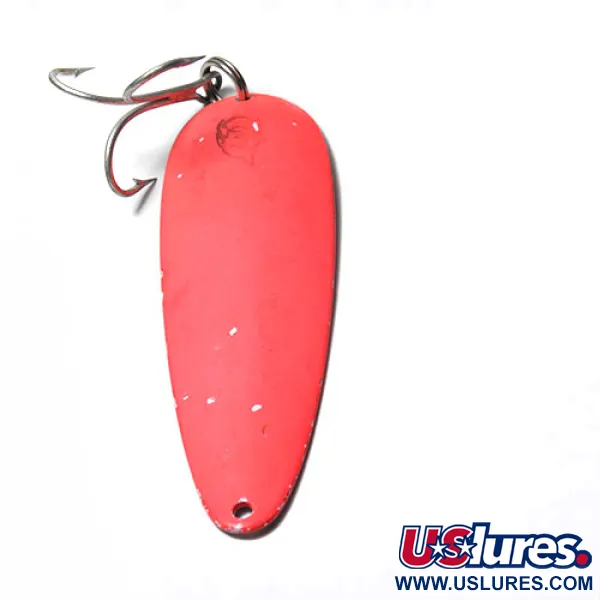 Pesant 28 g (1 oz), ce leurre offre un profil imposant pour les collectionneurs et les pêcheurs actifs. Mesurant 9 cm (3 1/2"), la face convexe présente une finition Rouge Foncé / Rose avec des taches blanches distinctives et le logo de l'imp pressé. Le revers de la cuillère révèle une surface concave argentée marquée « DARDEVLE DETROIT USA », un clin d'œil à l'héritage d'Eppinger dans le Michigan. Ce modèle, portant le code produit 0244, est équipé d'un hameçon triple robuste et d'un anneau brisé. Son état est évalué à 4/5, montrant de légers signes d'usure comme une petite perte de peinture près de l'œillet et sur les bords. La surface métallique intérieure reste propre et reflète bien la lumière.