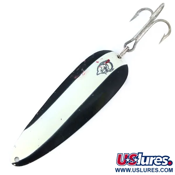 Le placage en nickel sur la face arrière offre un contraste éclatant avec les rayures blanches et noires sur l'avant de cette cuillère de 28 g (1 oz). Les marques Eppinger et Dardevle sont estampillées dans le métal au dos, reflétant la longue histoire de fabrication débutée dans l'atelier de Lou Eppinger à Détroit en 1906. Mesurant 9 cm (3 1/2") de long, ce modèle arbore le logo classique à tête de diable avec son détail rouge distinctif sur la face concave. Ce leurre spécifique, code 11016, est en état 4/5, présentant une peinture bien conservée et un armement propre. L'hameçon triple renforcé est fixé par un anneau brisé robuste, conçu pour les contraintes du lancer face aux grands prédateurs d'eau douce. Un œillet unique à l'extrémité effilée assure la connexion pour le lancer traditionnel ou la traîne. Ce coloris à haut contraste est un choix polyvalent pour s'adapter à la clarté de l'eau.