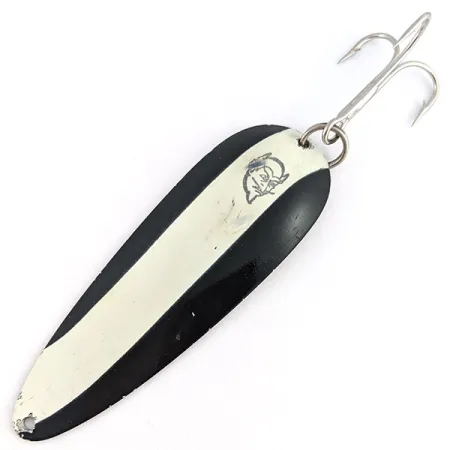 Pesant 28 g (1 oz), le corps en métal épais de cette cuillère ondulante offre la masse nécessaire pour des lancers à longue distance. Le coloris « Black Devle » assure une visibilité contrastée, avec une bande centrale blanc cassé entourée de noir intense, agrémentée du célèbre graphisme de tête de diable. Mesurant 9 cm (3 1/2"), ce modèle porte au dos l'inscription « DARDEVLE BY EPPINGER DEARBORN MI », témoignant de sa fabrication après le déménagement de l'entreprise de Detroit en 1959. Répertorié sous le code produit 23379, le leurre conserve son hameçon triple argenté et son anneau brisé d'origine. Son état est un respectable 4/5, présentant seulement de légères éraflures de surface sur le dos chromé et de petits éclats de peinture à la pointe, près de l'œillet d'attache. Sa forme oblongue caractéristique et sa face concave produisent une nage oscillante lors de la récupération. Cette cuillère de fabrication américaine mise sur son poids pour rester en profondeur et cibler le brochet ou la grosse truite. Le poids et les détails du fabricant sont gravés profondément dans le métal au dos, garantissant que les marquages restent lisibles avec le temps.