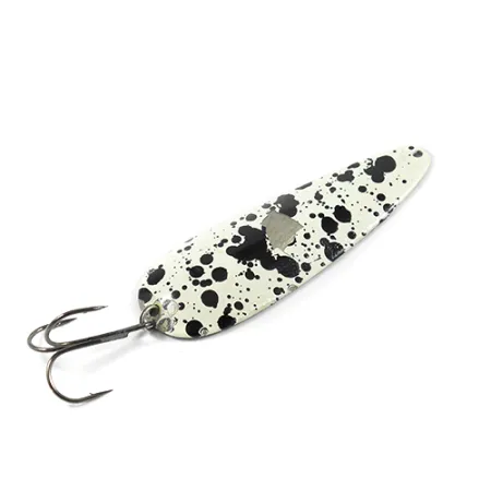 Dotée d'une finition « Dalmatien » très contrastée, cette cuillère de 28 g (1 oz) constitue un choix esthétique unique dans la légendaire gamme Eppinger. D'une longueur de 9 cm (3 1/2"), le leurre présente le profil concave caractéristique qui produit une nage oscillante typique lors d'une récupération régulière. Au dos, la surface nickelée est estampillée « DARDEVLET » et « DETROIT U.S.A. », identifiant l'héritage industriel commencé par Lou Eppinger en 1906. Cet exemplaire, identifié par le code produit 2370, conserve un état de 4/5, avec une peinture bien conservée sur la face convexe et un brillant métallique au dos. Le métal épais et l'hameçon triple piquant témoignent de l'utilité qui a jadis fait de ces leurres un équipement standard dans les kits de survie de l'aviation militaire. L'utilisation d'une cuillère à dos nickelé est une tactique éprouvée pour les eaux claires où un maximum de reflets est requis pour attirer l'attention. Les anneaux brisés restent fermes, assurant le maintien de l'hameçon pour le lancer lourd ou la traîne.