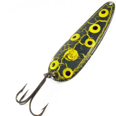 Pesant 28 g (1 oz), cette cuillère ondulante classique représente l'héritage durable des origines de Lou Eppinger à Détroit en 1906. Le motif de couleur Frog présente une base jaune frappante décorée d'une texture craquelée vert foncé et de points en forme d'yeux audacieux, contrastant avec une finition nickel brillant au verso. Mesurant 9 cm (3 1/2"), la forme oblongue caractéristique de la cuillère et sa surface concave profonde sont le résultat des matrices de fabrication exclusives d'Eppinger, conçues pour offrir un mouvement oscillant distinct lors du lancer ou de la traîne. Sous le code produit 3498, ce leurre particulier reste en excellente forme, recevant une note de condition de 5/5. Sur le dos poli, les estampilles authentiques « DARDEVLE », « EPPINGER » et « U.S.A. » sont clairement lisibles, l'identifiant comme une véritable pièce de fabrication américaine. L'armement comprend un hameçon triple robuste fixé par un anneau brisé. Bien que Lou Eppinger ait transféré ses activités à Dearborn en 1959, la conception fondamentale reste inchangée car elle a prouvé son efficacité depuis plus de cent ans. Même le gouvernement des États-Unis a reconnu la fiabilité de cette conception, incluant les cuillères Dardevle dans les kits de survie militaires en temps de guerre.