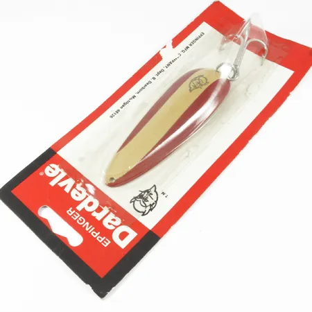 Pesant 28g (1oz), cette cuillère ondulante classique est un incontournable pour le lancer ou la traîne. Le corps de 9cm (3 1/2") présente la silhouette distinctive d'Eppinger, finie dans un motif Rouge/Blanc/Nickel avec une bande centrale beige unique sur ce spécimen. Portant le code produit 3538, le leurre est dans son emballage d'origine et n'a jamais servi. L'estampage net du logo de tête de diable sur le devant reflète l'héritage de la société fondée par Lou Eppinger à Détroit, qui a déménagé à Dearborn, Michigan, en 1959. Le dos nickelé offre une surface réfléchissante brillante contrastant avec la peinture rouge profond, une combinaison utilisée pour la visibilité sous diverses luminosités. L'armement se compose d'un hameçon triple robuste et piquant d'origine fixé à la queue. Le support en carton est intact, témoignant de l'héritage du matériel de pêche fabriqué dans le Michigan.