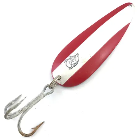 Pesant un solide 28 g (1 oz), cette cuillère ondulante classique arbore les emblématiques rayures diagonales rouges et blanches qui définissent les leurres Eppinger depuis des générations. Mesurant 9 cm (3 1/2"), ce spécimen particulier, code produit 5299, représente le savoir-faire robuste indissociable de l'histoire de la marque dans le Michigan. L'avant affiche le célèbre graphisme de tête de diable noir, imprimé sur la bande centrale blanche. Au dos, la finition en nickel poli est clairement estampillée « DARDEVLE DETROIT, U.S.A. », un détail qui situe sa production à l'époque où l'entreprise était établie dans sa ville d'origine. Côté état, elle est notée 4/5, montrant de légers éclats de peinture et de petites taches de surface sur les zones rouges, ainsi qu'une oxydation typique sur l'hameçon triple renforcé. Le placage en nickel de la face inférieure a bien conservé son éclat au fil du temps. Ce leurre est conçu avec une plaque de métal épaisse, ce qui en fait un choix fiable pour les lancers à longue distance. L'armement, incluant l'anneau brisé d'origine et l'hameçon triple, reste intact et fonctionnel pour tout collectionneur recherchant un témoin authentique de l'histoire de la pêche à Détroit.