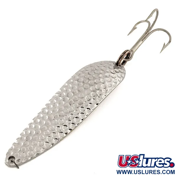 Un placage en nickel martelé définit la surface texturée frappante de cette cuillère Eppinger, captant efficacement la lumière de toutes les directions. Mesurant 8,5 cm (3 1/4 pouces) et pesant 21 g (3/4 oz), ce spécimen représente le modèle classique Dardevle Cop-E-Cat. Son état est remarquablement propre, justifiant une note de 5/5 pour sa finition brillante et son armement piquant. Référencée sous le code 11638, le revers est frappé du marquage Cop-E-Cat et du nom Eppinger, héritage de l'usine de Dearborn, Michigan. Elle est équipée d'un hameçon triple robuste attaché par un anneau brisé solide à la queue. Le corps métallique concave est fabriqué à l'aide de matrices exclusives fabriquées aux États-Unis, conçues spécifiquement pour le lancer et les techniques de récupération lente. Un petit œillet d'attache est positionné au niveau de la tête effilée, assurant une connexion fiable pour le bas de ligne du pêcheur.
